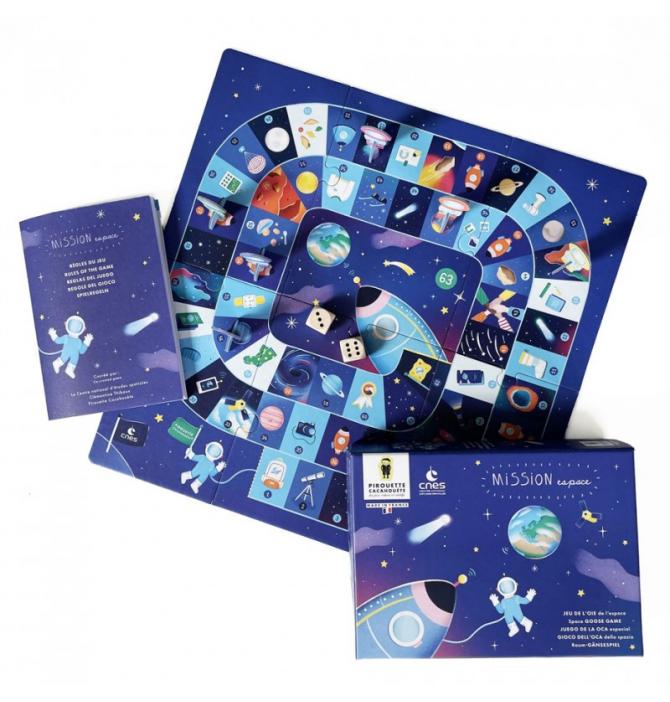Une mission spatiale se déroule tout au long de la célèbre spirale pour atteindre la case 63 en premier. Les fusées aident à avancer plus vite, mais attention au trou noir et autres cases pièges !